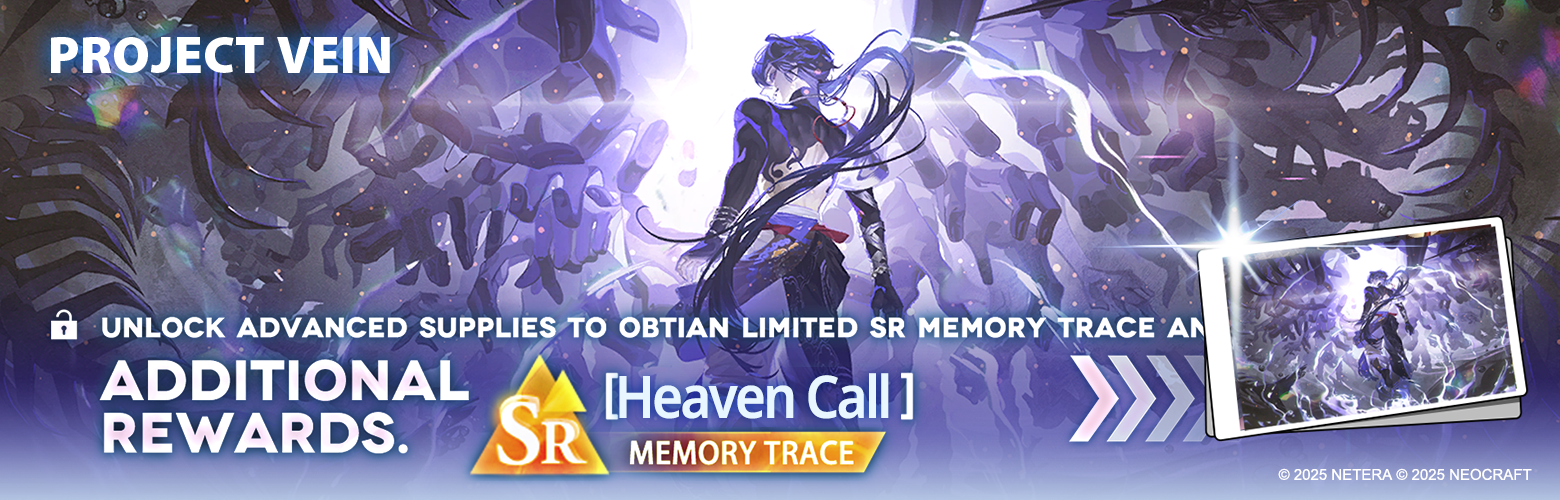 EVENT INFO: During this event, Directors can increase Project Vein Level by completing tasks in PROJECT VEIN to gain abundant rewards. Unlock [Advance Plan] to increase your Project Vein Level by 10, get the limited SR Memory Trace [Heaven Call], Tea Time Universal Invitations, and advanced supplies!