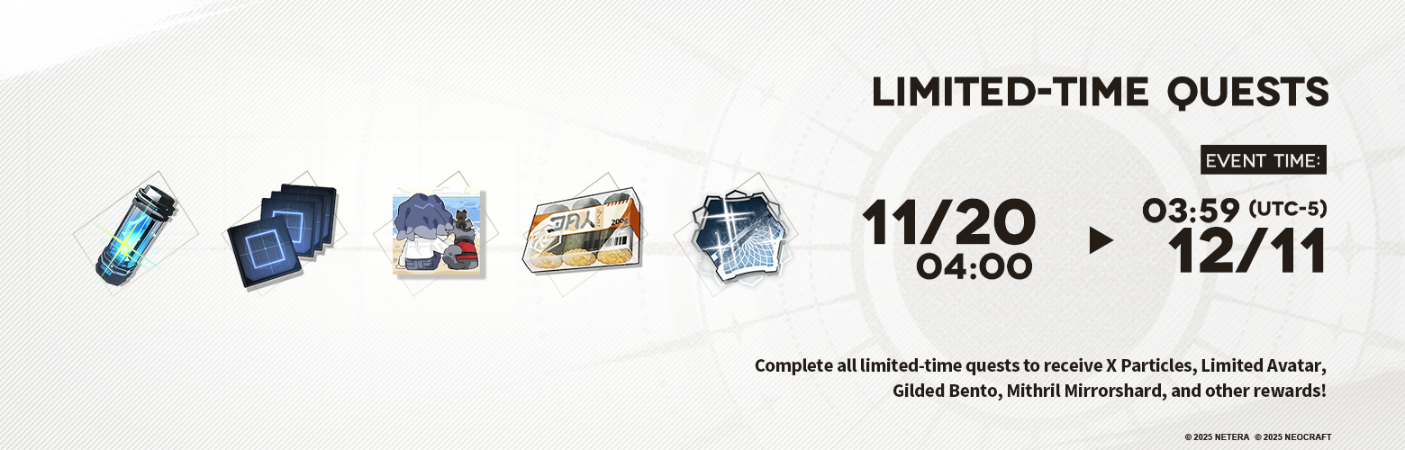 DETAILS:  Complete all limited-time quests to receive X Particles, Limited Avatar, Gilded Bento, Mithril Mirrorshard and other rewards!