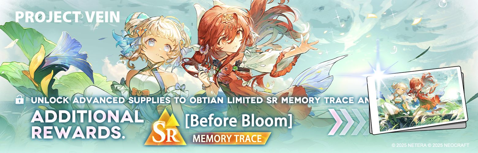 EVENT INFO: During this event, Directors can increase Project Vein Level by completing tasks in PROJECT VEIN to gain abundant rewards. Unlock [Advance Plan] to increase your Project Vein Level by 10, get the limited SR Memory Trace [Before Bloom], Tea Time Universal Invitations, and advanced supplies!